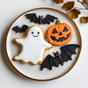 ハロウィンのテーマにぴったりのカラフルなクッキーのイメージです。カボチャやお化けなどハロウィンを象徴するデザインが描かれた可愛らしいクッキーが並んでいます。見ているだけで楽しく、手作り感がありながらも丁寧に仕上げられたデコレーションが魅力的。