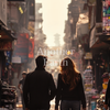 色とりどりの建物や活気あふれる街の風景が背景に広がり、カップルの幸せそうな様子が一層引き立っています。異国情緒あふれる旅のひとときを感じさせるこの一枚は、異文化体験やロマンチックな旅行のシーンにぴったりです