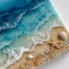 きらめく波や砂浜、貝殻などが閉じ込められた美しい海のアート。光が透過するたびに表情を変える、まるで本物の海を切り取ったかのような神秘的な作品です。