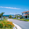 色とりどりの花が咲き誇る、美しい路地の両脇にオレンジの屋根の住宅が建ち並んでいる