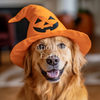 ジャックオランタンの帽子を被ってご機嫌なゴールデンレトリーバー