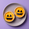 愛らしいジャックオーランタンの顔がデザインされた、パンプキンタルトの画像です。かぼちゃの甘い香りとサクサクのタルト生地がハロウィンパーティーを美味しく彩ります。秋の味覚とイベントの楽しさを伝えるのに最適な写真映えするスイーツです。