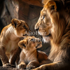サバンナの草原で、母ライオンが子ライオンを優しく見つめる姿。野生動物の絆の深さを感じさせる、心温まる一枚。