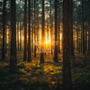 静寂と温かさが感じられる美しい風景を描いた画像です。黄金色に染まる空と、木々のシルエットが柔らかな光に包まれ、心地よい穏やかさが広がっています。夕日が林の中に差し込むことで、木々の葉が輝き、まるで時間が静止したかのような幻想的な雰囲気を生み出しています。