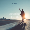 広大な空港の滑走路に迷い込み、飛び立つ飛行機を見送るように手を挙げるサラリーマンのシュールな画像です。