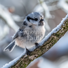 雪に覆われた枝に止まる、長い尾羽を持っている小さな鳥